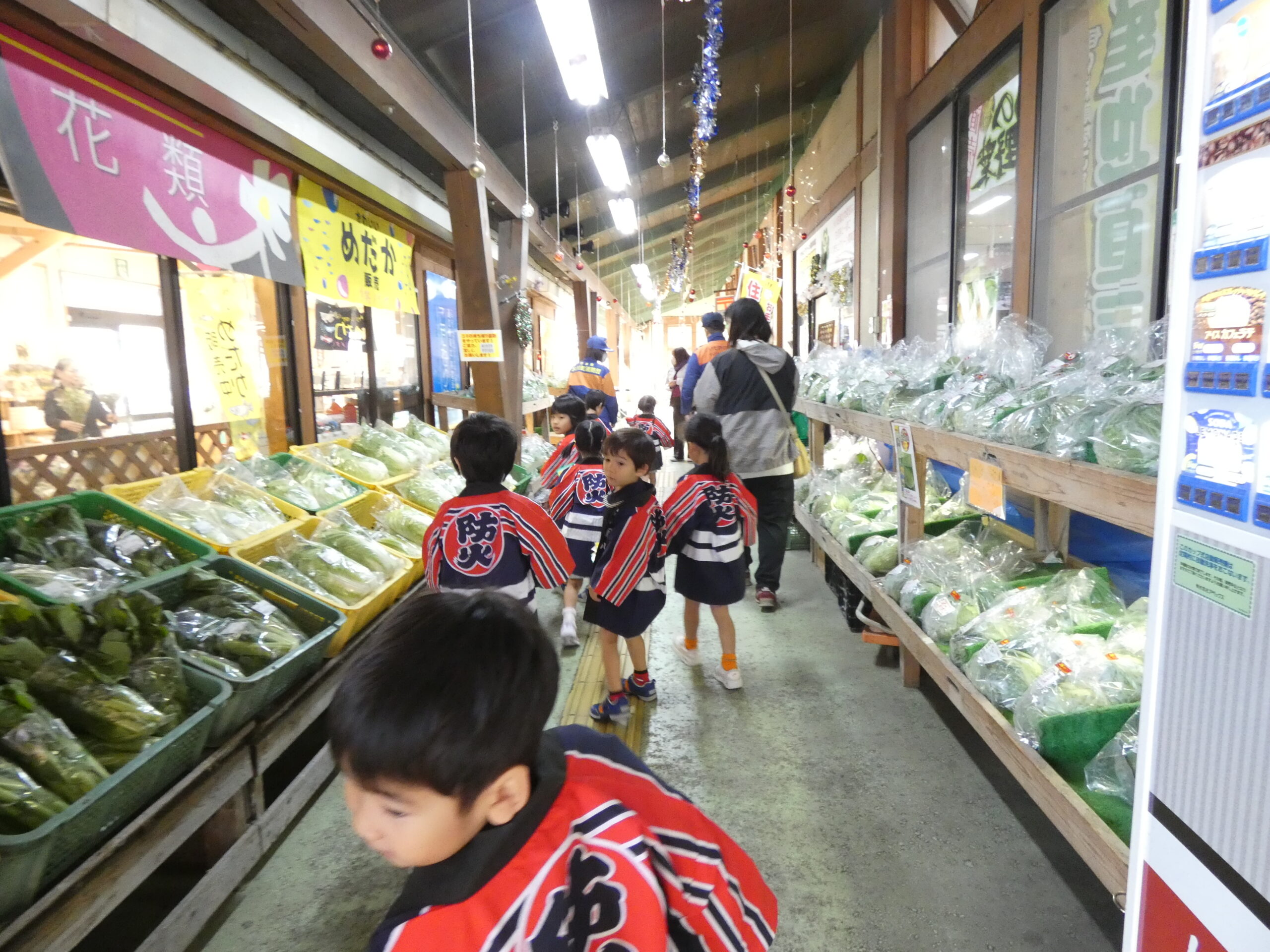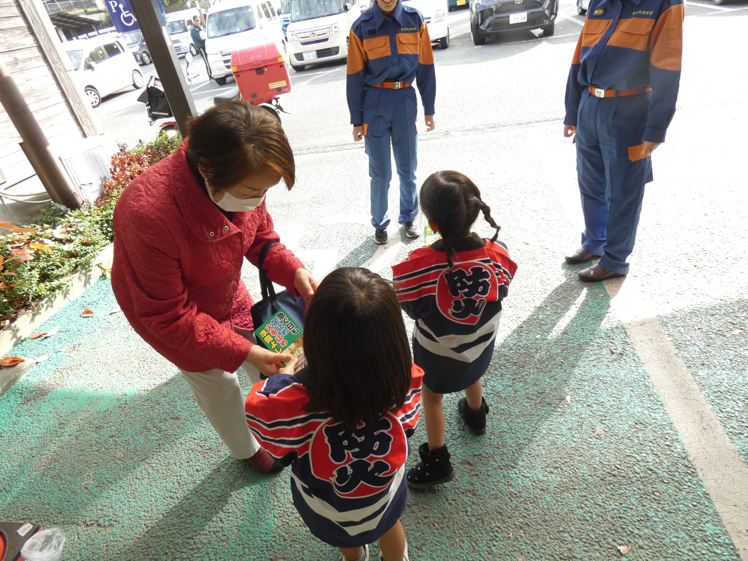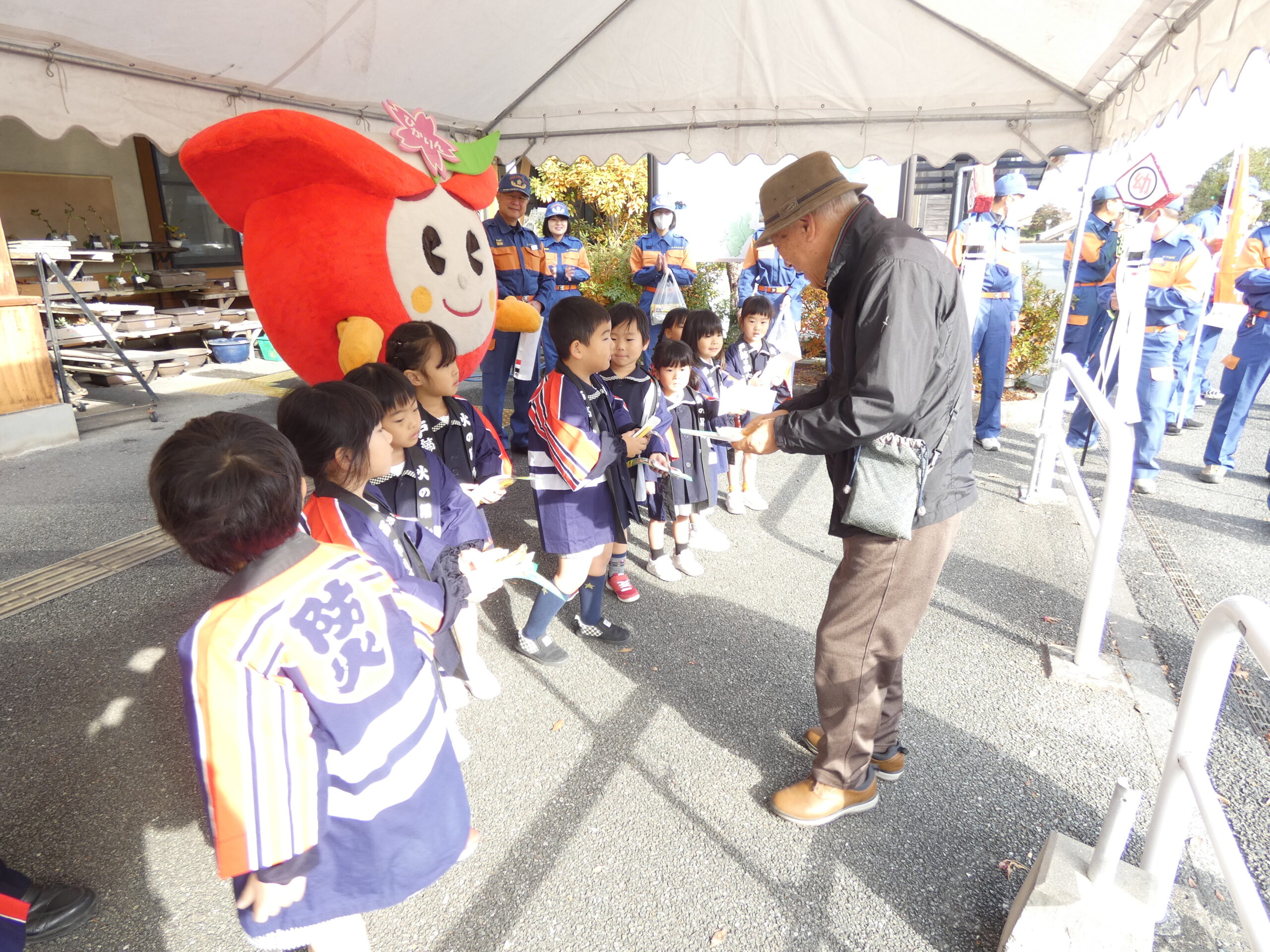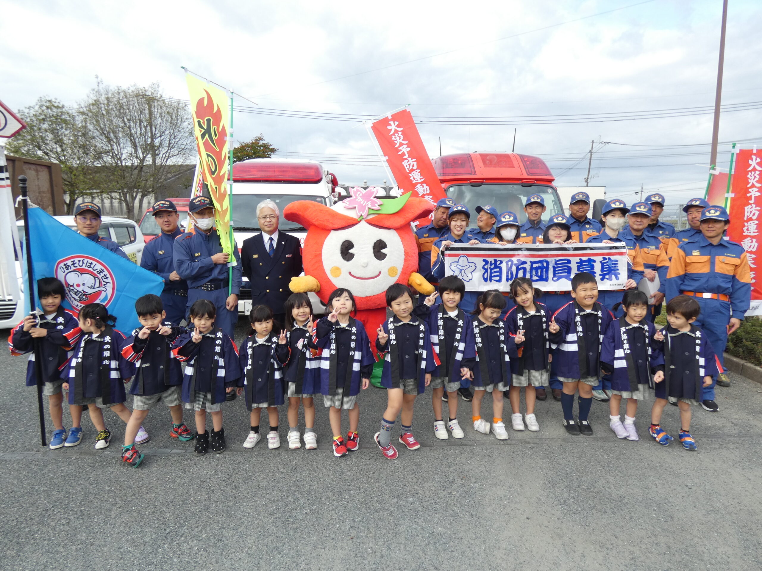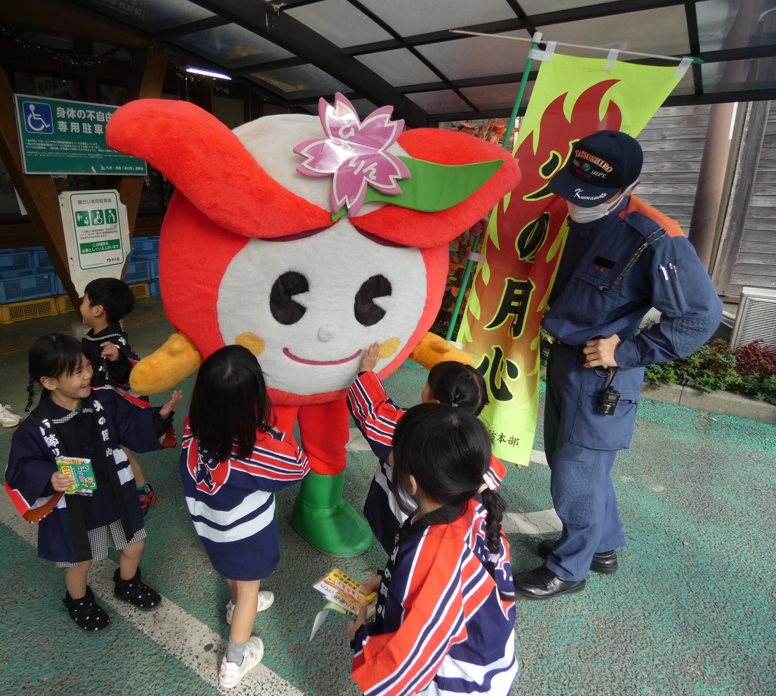 勝専坊学園幼年消防クラブの園児たちをはじめ、氷川町消防団員、氷川町PRキャラクター「ひかりん」、そして消防職員が店頭に立ち、『火の用心』を呼びかけました。