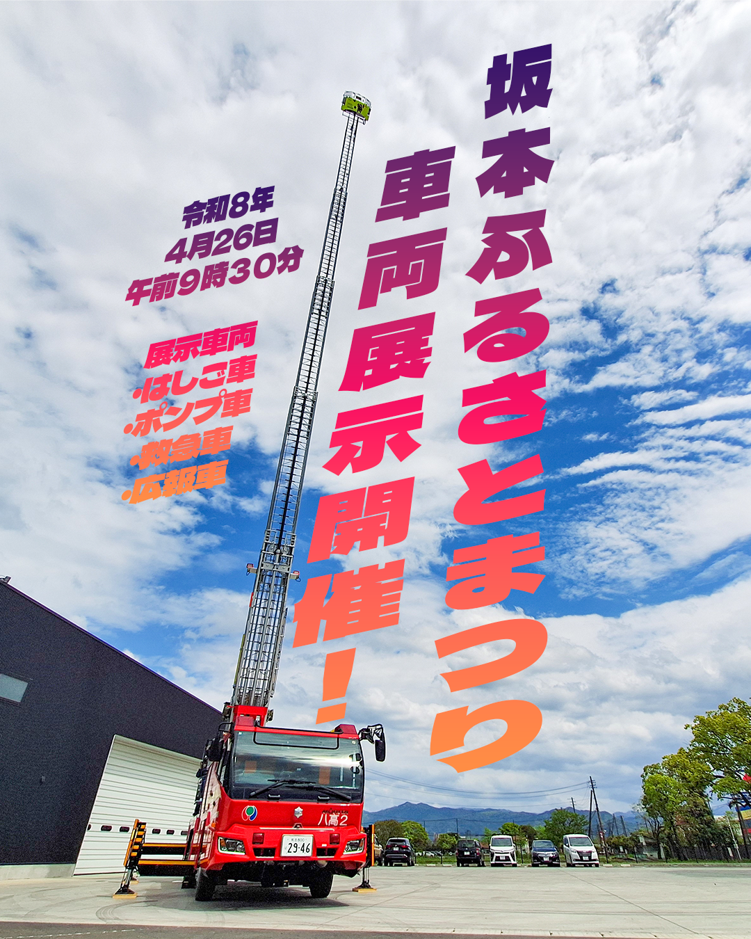 ※展示車両は、はしご車・ポンプ車・救急車・広報車です。赤バイはありませんのでご了承ください。
