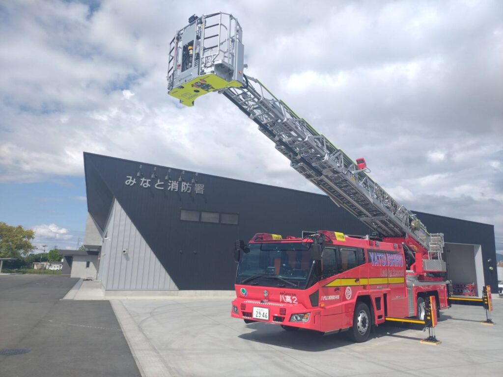 内容は、地元消防団である八代市消防団坂本方面隊のみなさんと協力して、水消火器を使った消火体験や最長35mまで伸長できるはしご車の展示を実施します。